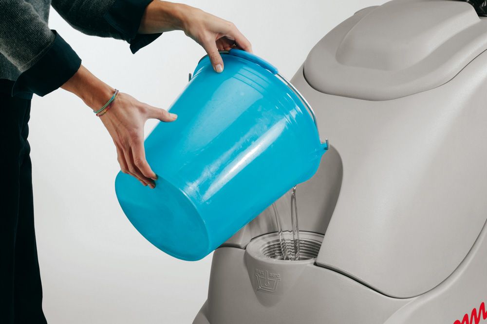 • Эргономичная и простая в использовании машина: просто залейте в бак раствор, установите щетку и опустите сквидж для начала работы